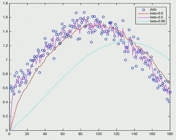 ※ β=0.9면 대략 직전 10개까지 moving average 적용한 효과가 있다. 대부분 β의 기본값은 0.9로 셋팅되어 있다.