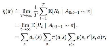average reward setting에서는 policy π의 quality는 아래와 같이 average rate of reward r(π)로 정의한다.