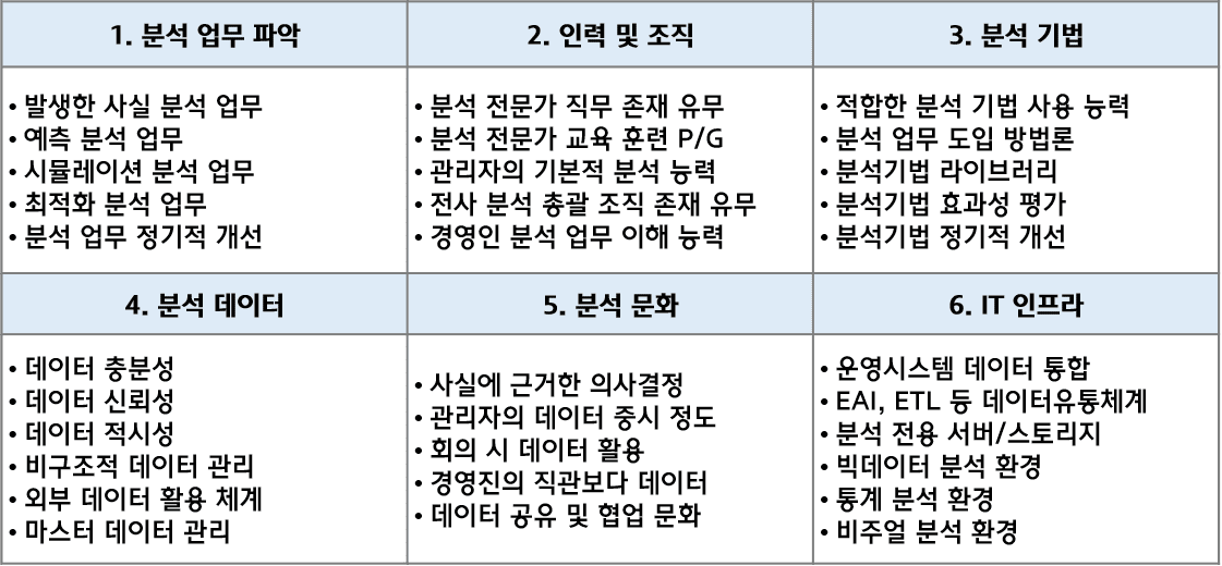 - 6개 영역의 분석 준비도 + 3개 영역의 분석 성숙도를 동시 평가