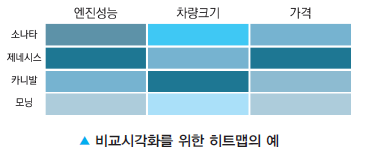 - 데이터를 식별하기 위해 각각의 칸마다 색으로 수치의 정도를 표현